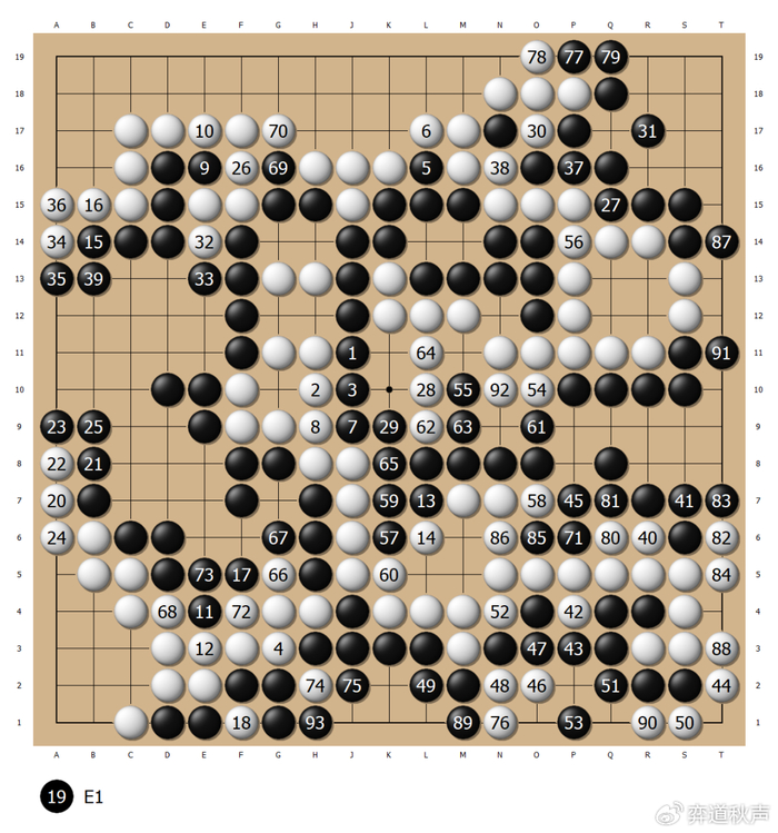 黑21粘上后,黑棋全局厚实,实空也不落后,掌握了主动权。